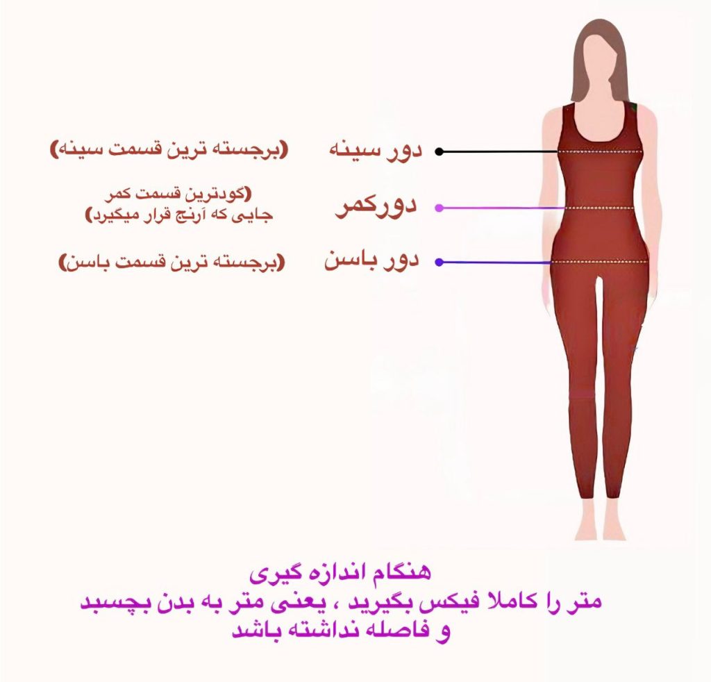 - اندازهگیریها را ترجیحاً روی لباس نازک و در حالت طبیعی بدن انجام دهید.