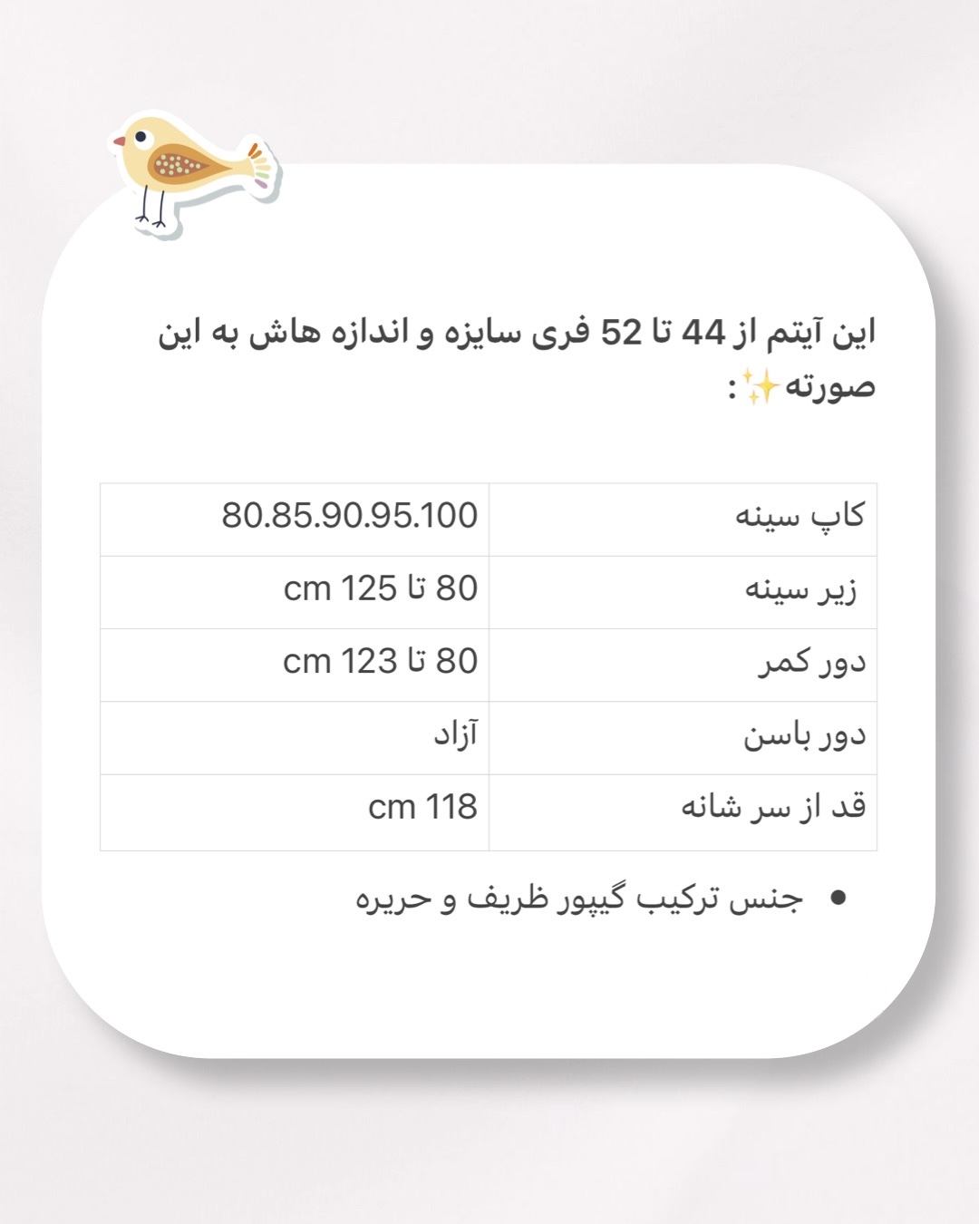 - اندازه های دقیق داخل جدول راهنمای سایز قرار دارد🦋