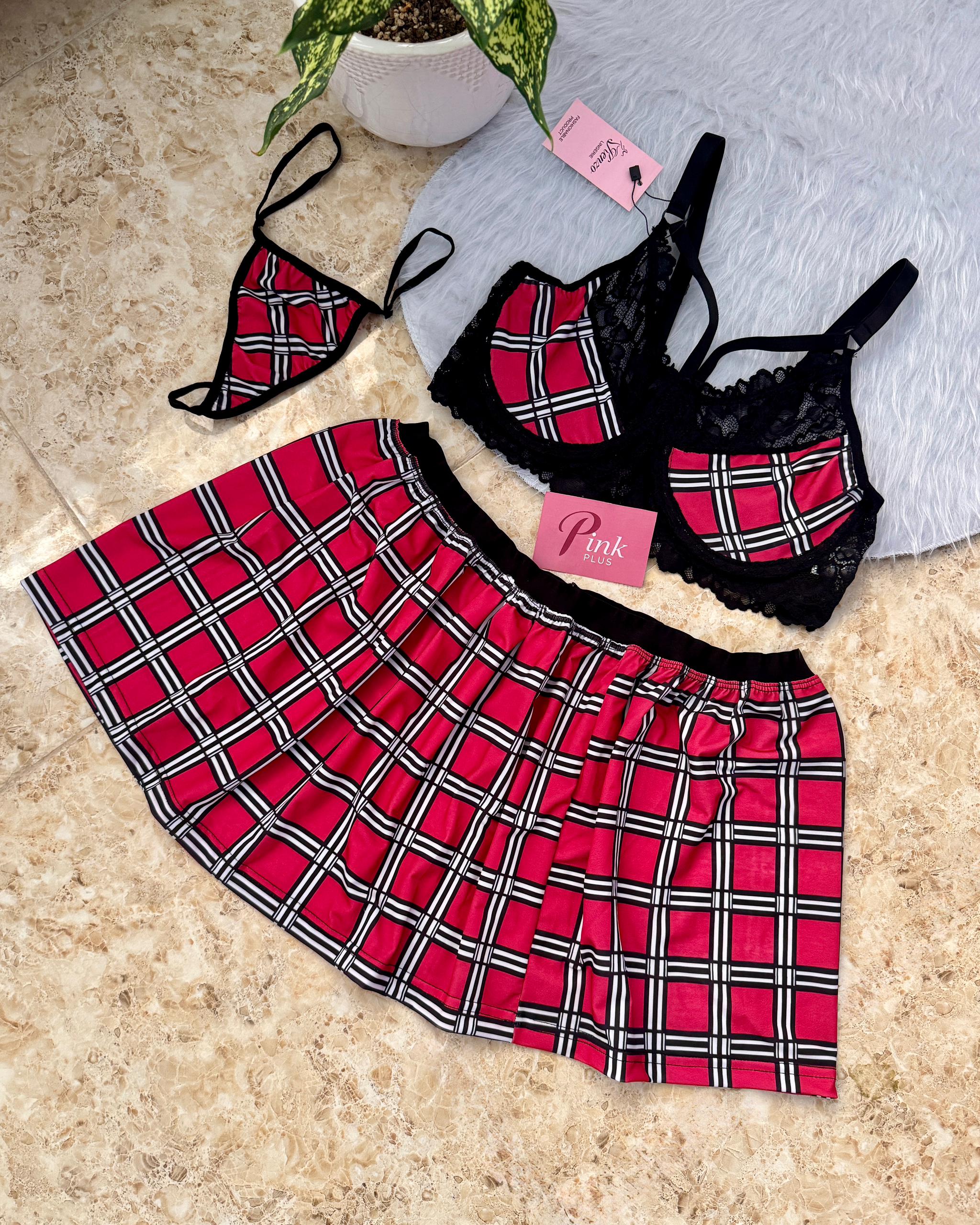 - 3 تیکه : سوتین(نیم تنه) ، دامن و شورت